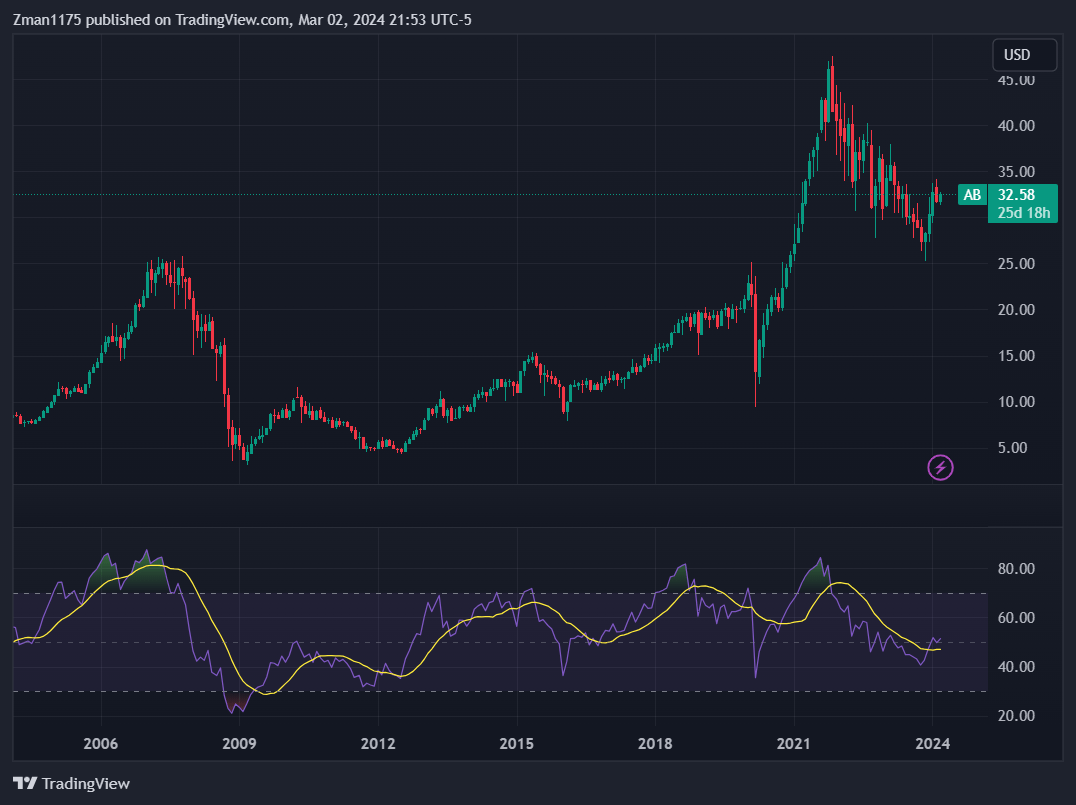 AllianceBernstein (AB) Monthly Chart with RSI (Tradingview)