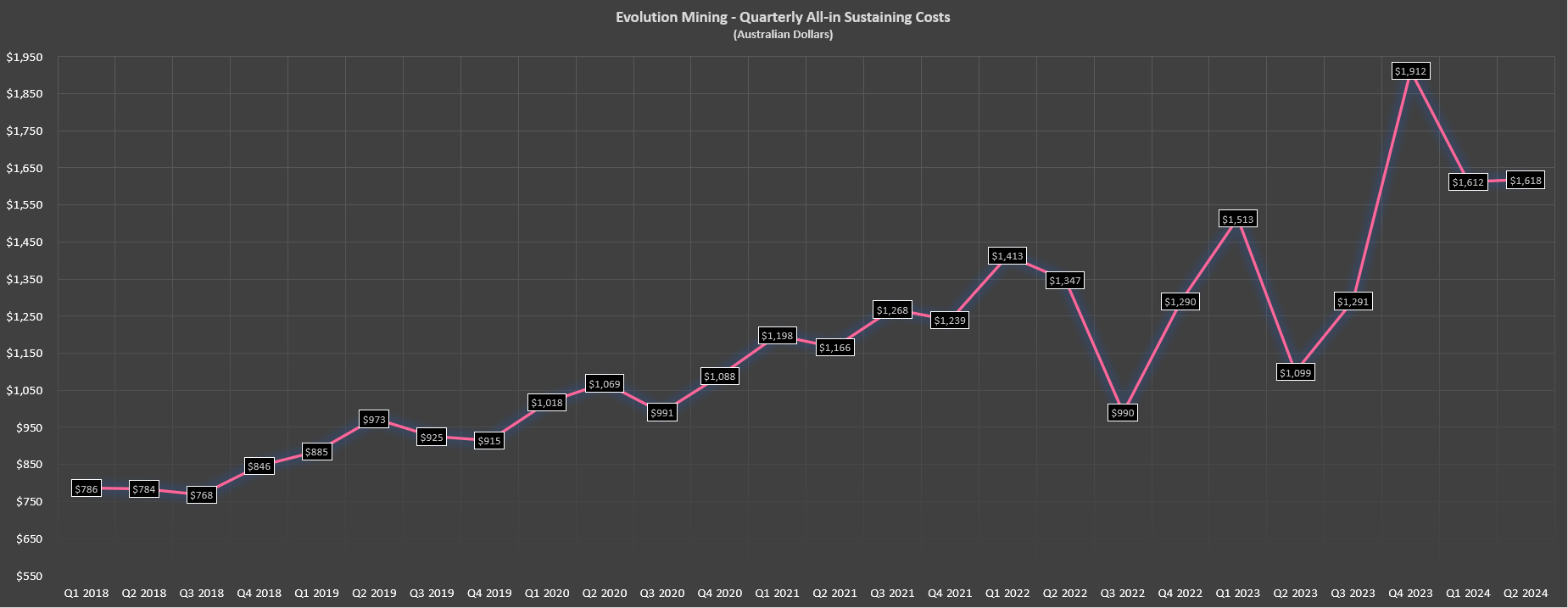 Evolution Mining All-in Sustaining Costs (A$) - Company Filings, Author's Chart