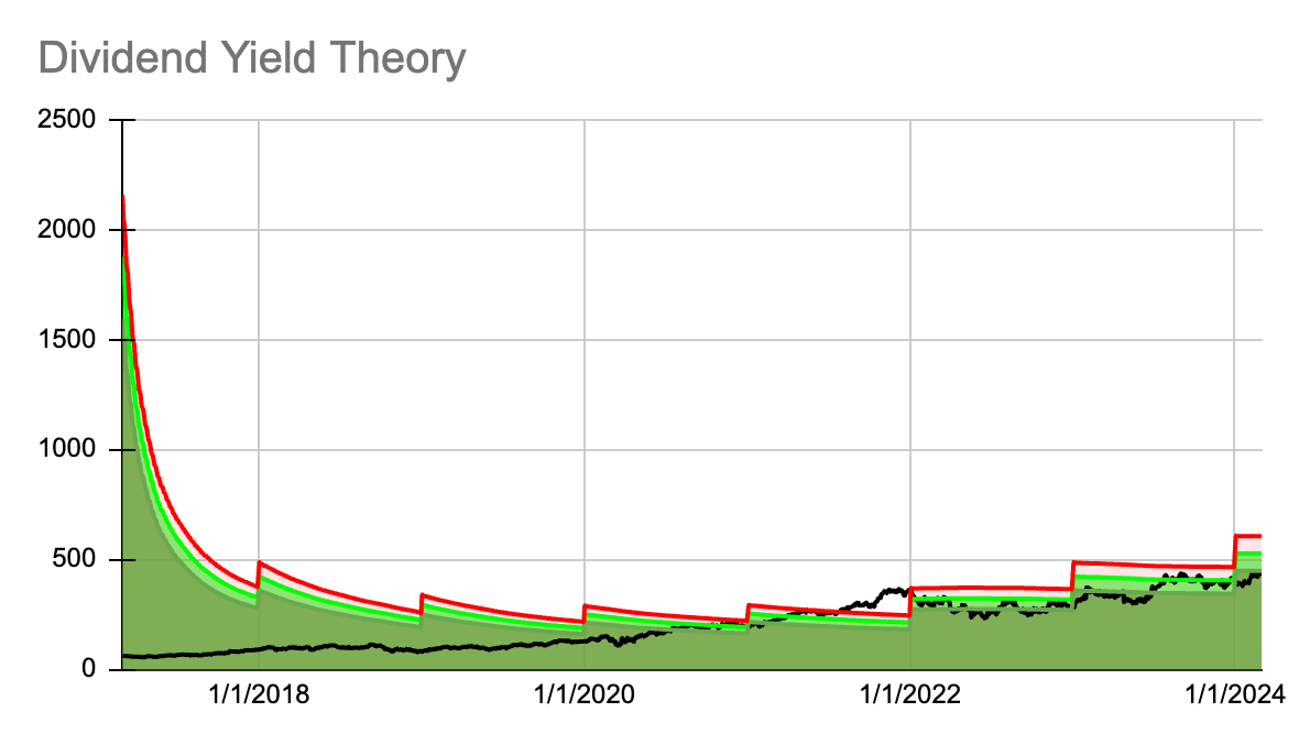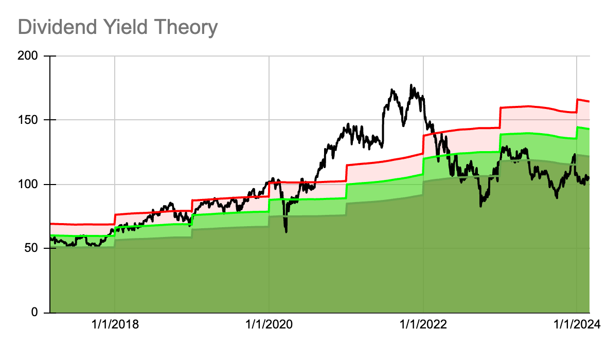 Below are a 7-year dividend yield theory chart, a dividend history chart, and a dividend growth table for the 5 new stocks on the watchlist this month.