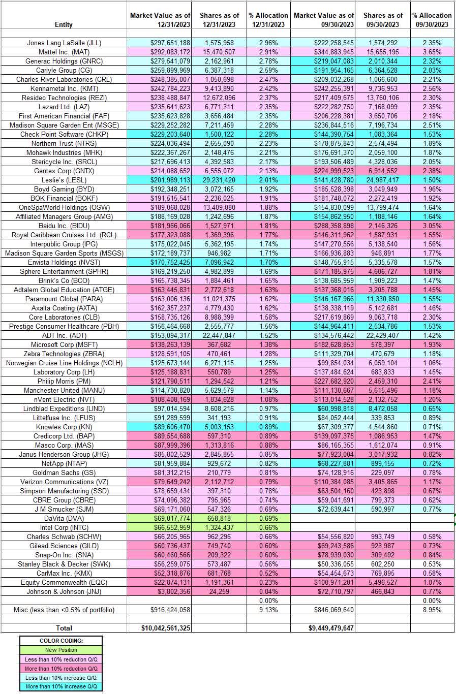 Below is a spreadsheet that shows the changes to John Rogers' Ariel Investments 13F portfolio holdings as of Q4 2023: