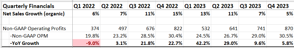 Motorola has witnessed strong margin expansion and FCF growth. They delivered 5% organic revenue growth and 5.8% adjusted operating profit growth in Q4 FY23, as shown in the tables below. For the full year, their adjusted operating profit was increased by 18%, and they delivered the record-high FCF of $1.8 billion.