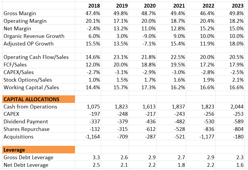 I calculate the operating expense growth to be 70bps lower than the topline growth, leading to 40bps margin expansion per year. Their margin expansion is driven primarily by operating leverage, pricing growth and increasing penetration of software component.