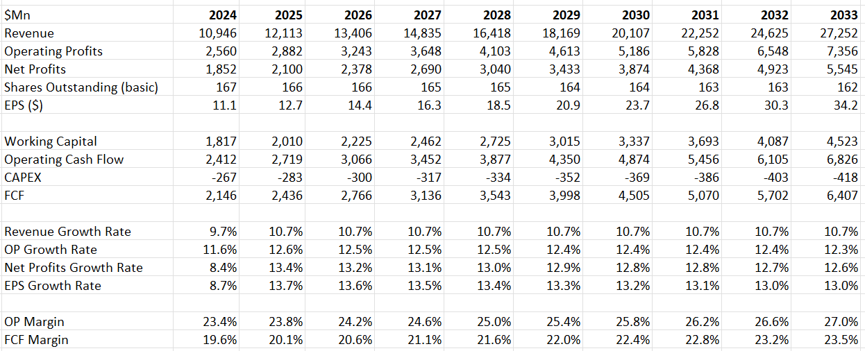 Regarding the DCF model, I assume 8% organic revenue growth in FY24 as discussed previously. Assuming Motorola allocating 5% of revenue toward acquisitions, M&A could add 1.7% of topline growth. For the normalized growth, I assume 9% organic revenue growth, reflecting the potential acceleration from software and service as their revenue mix gradually increases.
