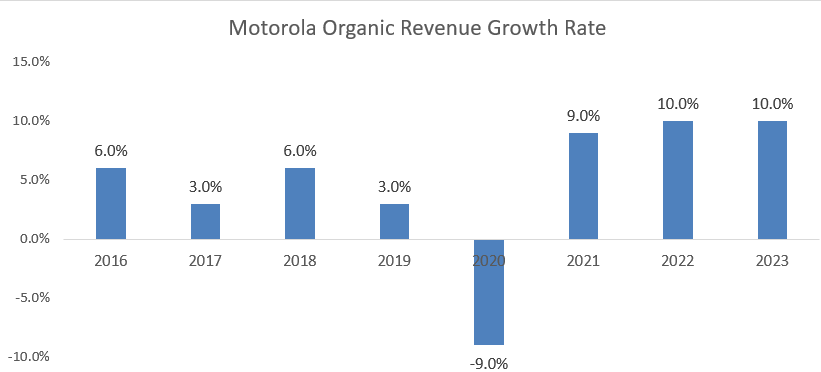 Lastly, APX NEXT device refreshment cycle is expected to persist in FY24, as indicated by their management. Putting all together, I anticipate Motorola will deliver 7%-8% organic revenue growth in FY24.