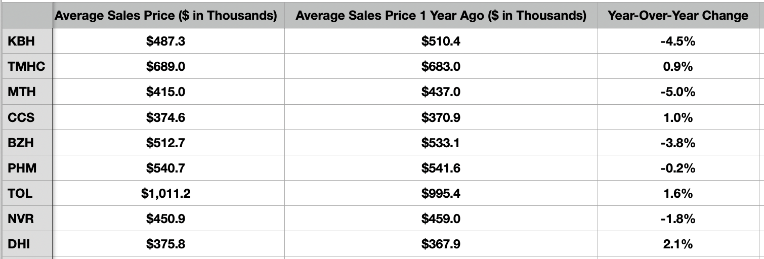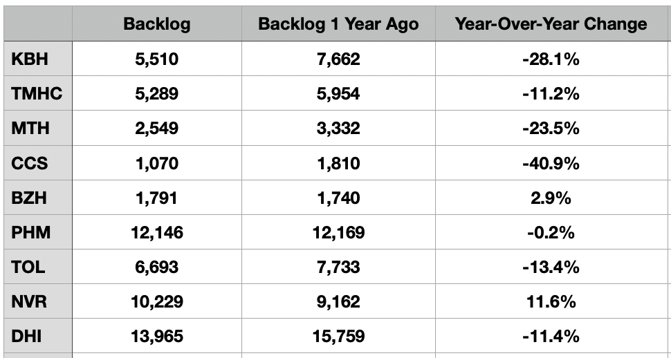 As a group, backlog is down 9.3% now compared to what it was one year earlier. But not every company has had the same kind of experience. Century Communities (CCS), for instance, has seen the greatest pain, with backlog down 40.9% year over year. On the other side of the spectrum, you have two companies that actually saw a year over year increase in backlog. The first of these is Beazer Homes USA (BZH), with a modest increase of 2.9%. And then you have NVR Inc. (NVR) with a gain of 11.6% year over year.