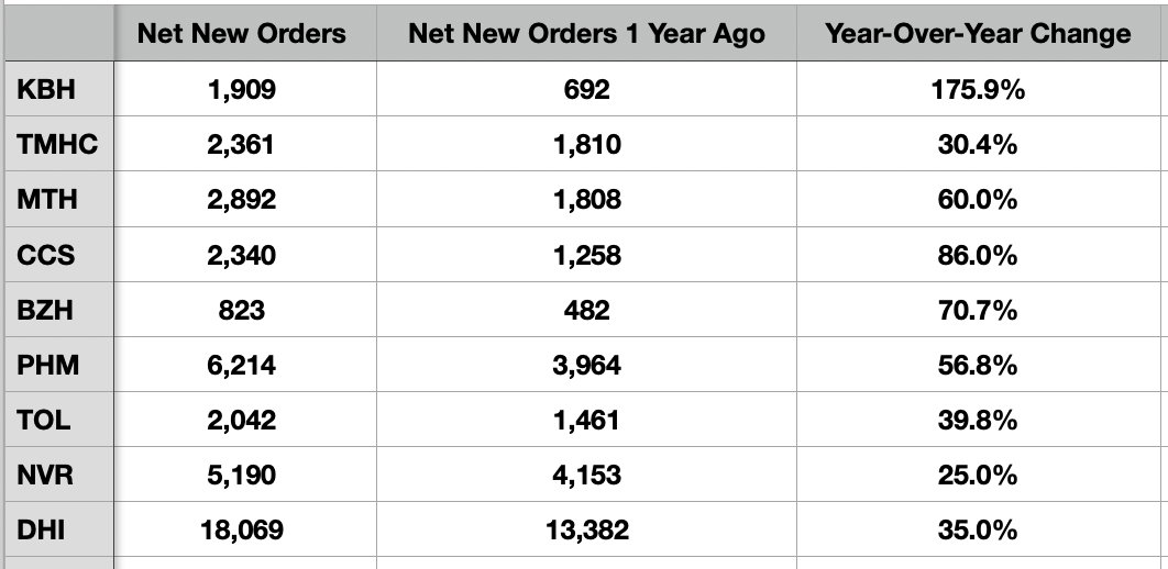 What's interesting to point out here is that, while backlog is down an amount that I would consider to be material, the actual number of homes delivered in the space, has dipped a modest 1.9%. Three of the nine companies that I dug up data for showed year over year increases. And one of these is the largest of all nine firms. With this suggests is that, even as the backlog was falling, the home builders were tirelessly working away at the orders that had been built up. The goal here was to continue to generate revenue and attractive cash flows at a time when the near-term picture was looking less and less certain. In theory, if this trend had continued for an extended period of time, a scenario where backlog approached zero would not have been out of the question. Fortunately, demand in the space proved to be far more robust than that.