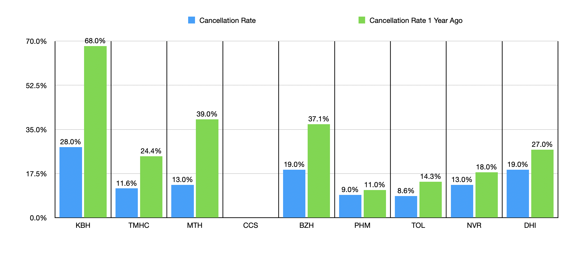 Another data point that I would like to bring up involves the cancellation rate of orders. It's one thing to see orders come in. It's another to see them canceled because of the hardship of those placing the orders or because of other reasons. Over a year ago, cancellation rates were through the roof. Eight of the nine companies that I'm covering in this article provide quarterly cancellation rate data. The worst of them was KB Home with a rate of 68% roughly a year ago. That number has now fallen to 28%. In fact, we have seen meaningful improvements across all eight businesses for which data is available.