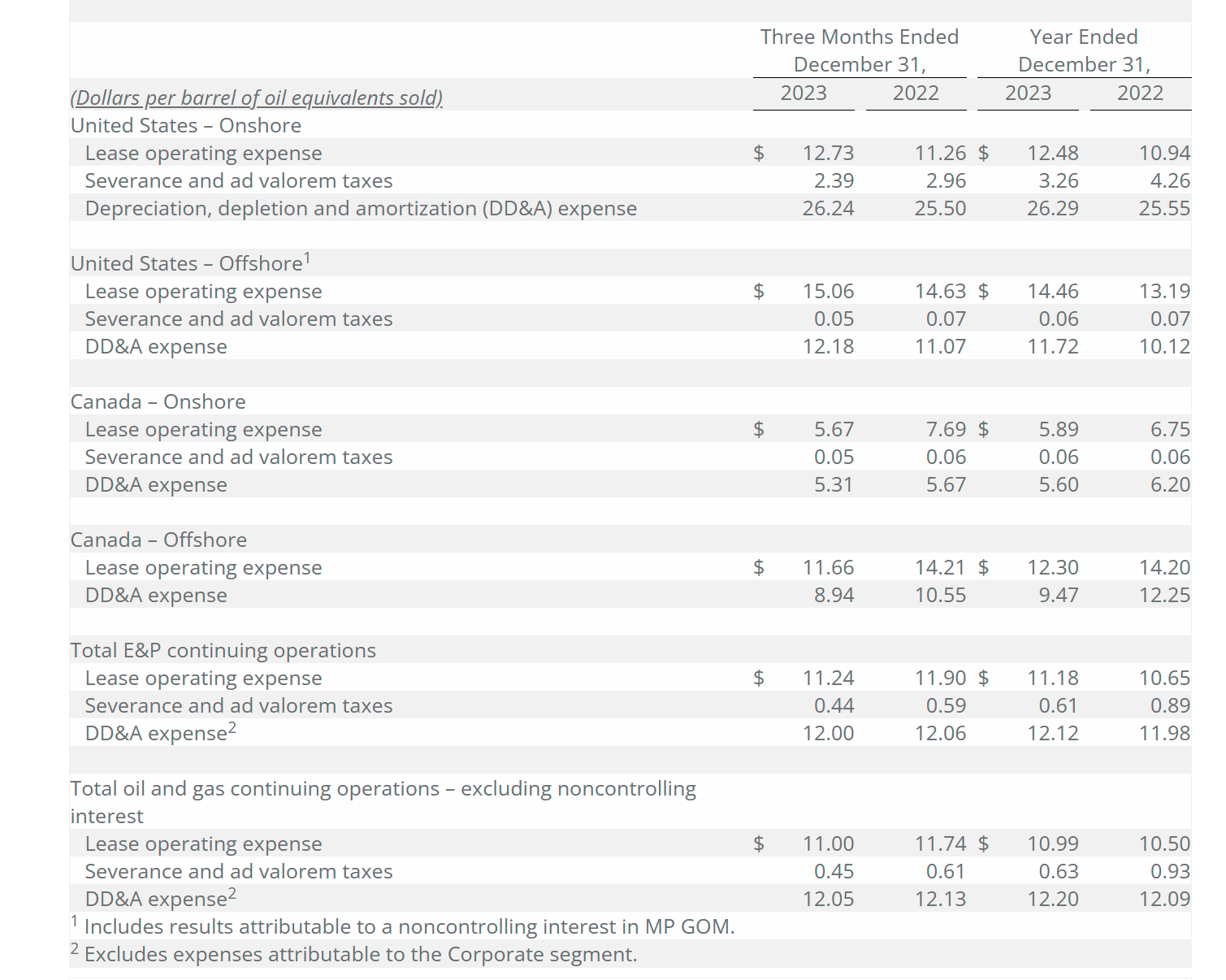 Murphy Oil Fourth Quarter 2023, Project Production Cost Comparison (Murphy "Oil Fourth Quarter 2023, Earnings Press Release)