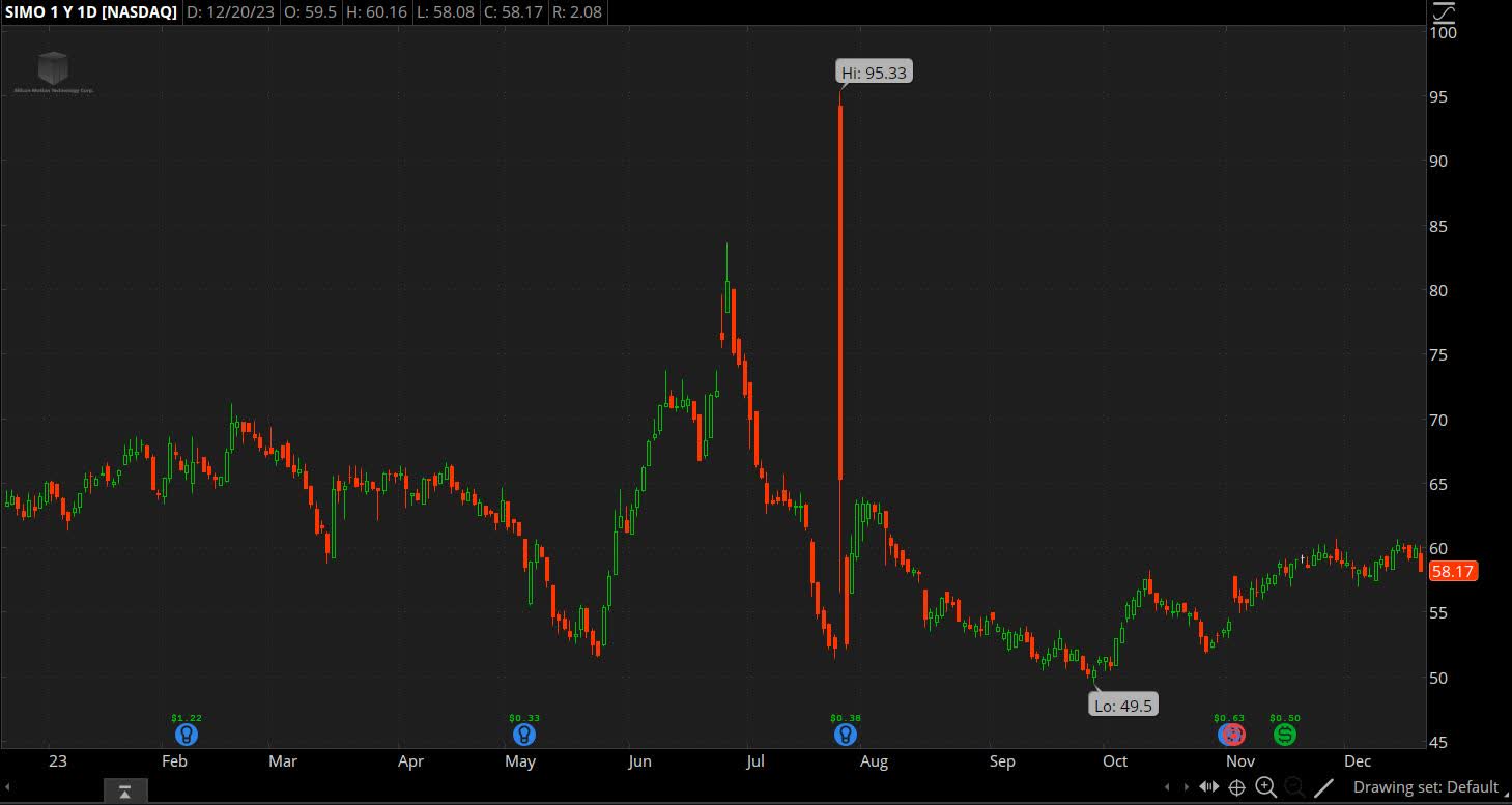 However, the quarterly results have improved from what may have been the low in Q1 and the outlook expects that improvement to continue in 2024. The general expectation is that the memory market will return in growth in 2024, which will drive demand at SIMO. The stock too has been on the rise. SIMO has appreciated by close to a fifth since entering the fourth quarter.