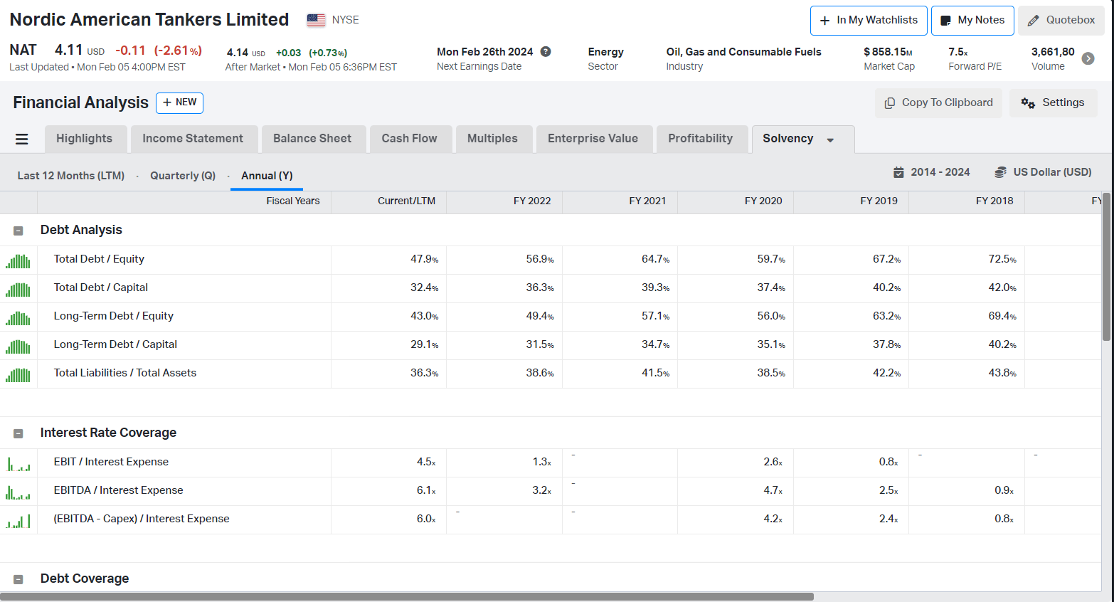 NAT has a robust balance sheet with $69 million cash (ex. restricted cash), $229 million long-term debt, and $255 million total debt. Over the last five years, the company maintained relatively low leverage, as seen in the table below.