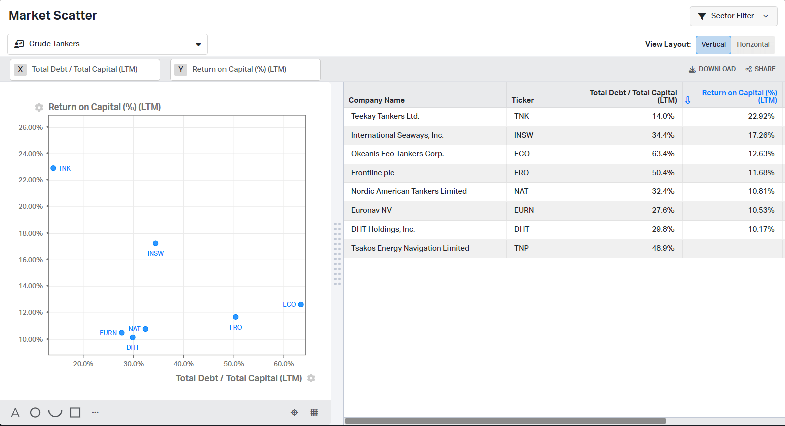 The following chart compares NAT, ECO, DHT, and major players in the crude tanker industry. INSW has product tankers, too. However, its crude fleet is larger than those of DHT, NAT, and ECO. The goal is to estimate how the companies allocate capital, measuring total debt/total capital and ROTC.
