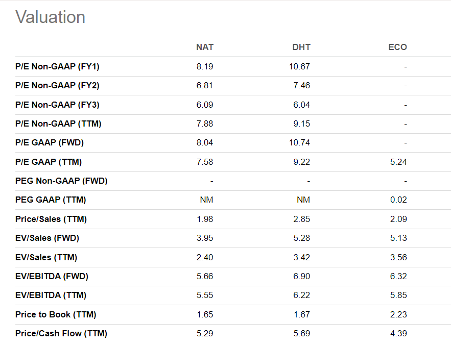 NAT is the cheapest in the peer group with 2.40 EV/Sales, 5.55 EV/EBITDA, and 1.65 P/BV compared to the group. ECO is the most expensive, with 3.56 EV/Sales, 2.23 P/BV, though DHT has the highest EV/EBITDA.