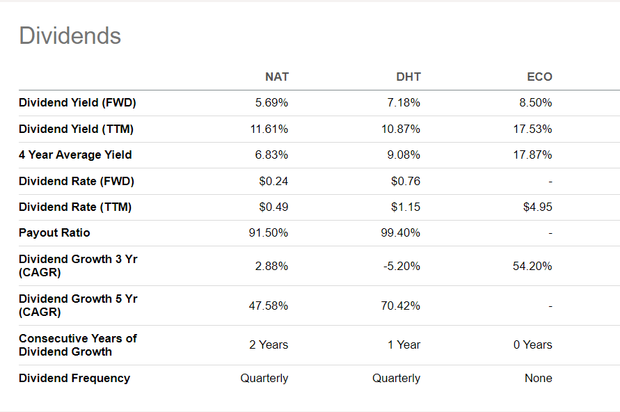 NAT touts itself as a dividend company, and it is deserved. The company has paid dividends for more than 100 consecutive quarters. TTM dividend yield is 11.61%. It is slightly higher than DHT’s 10.87% yield but lower than ECO’s 17.53%.