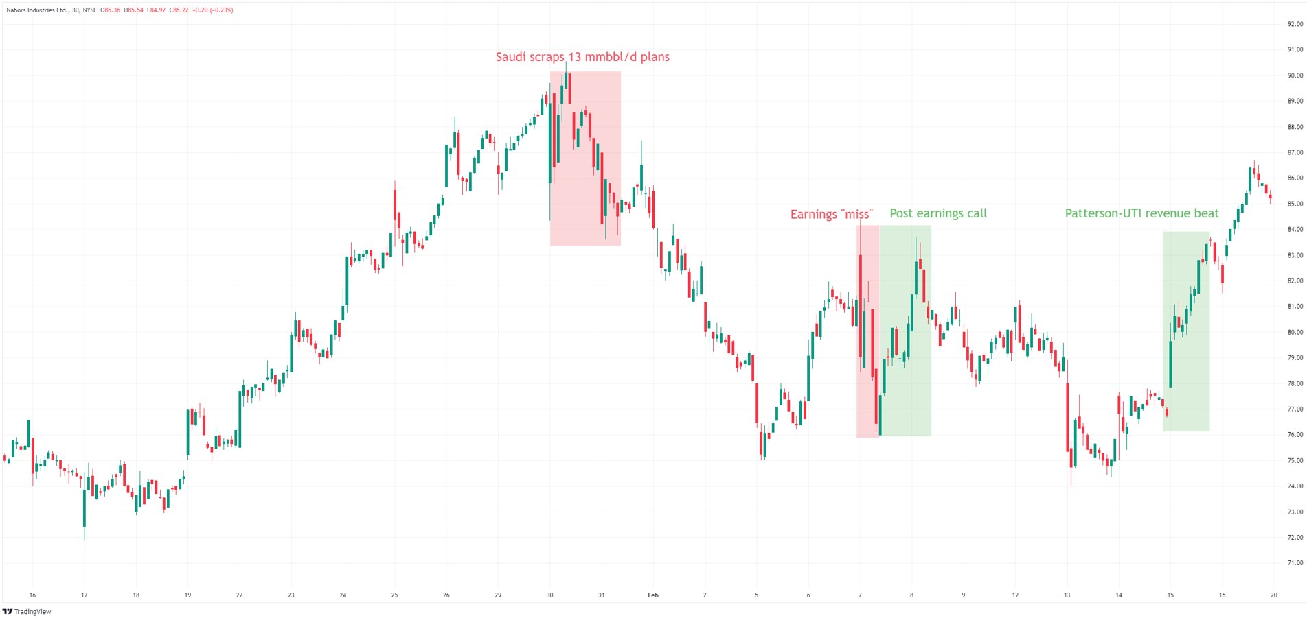 Nabors gave up most of its January gains and saw a couple of volatile sessions around its earnings "miss" (the earnings were good actually despite the headline EPS number). Last week, Nabors resumed its upward movement after its U.S. competitor Patterson-UTI (PTEN) reported a beat.
