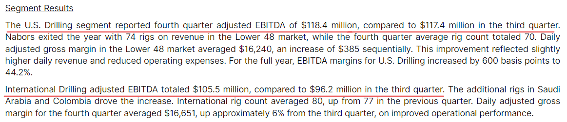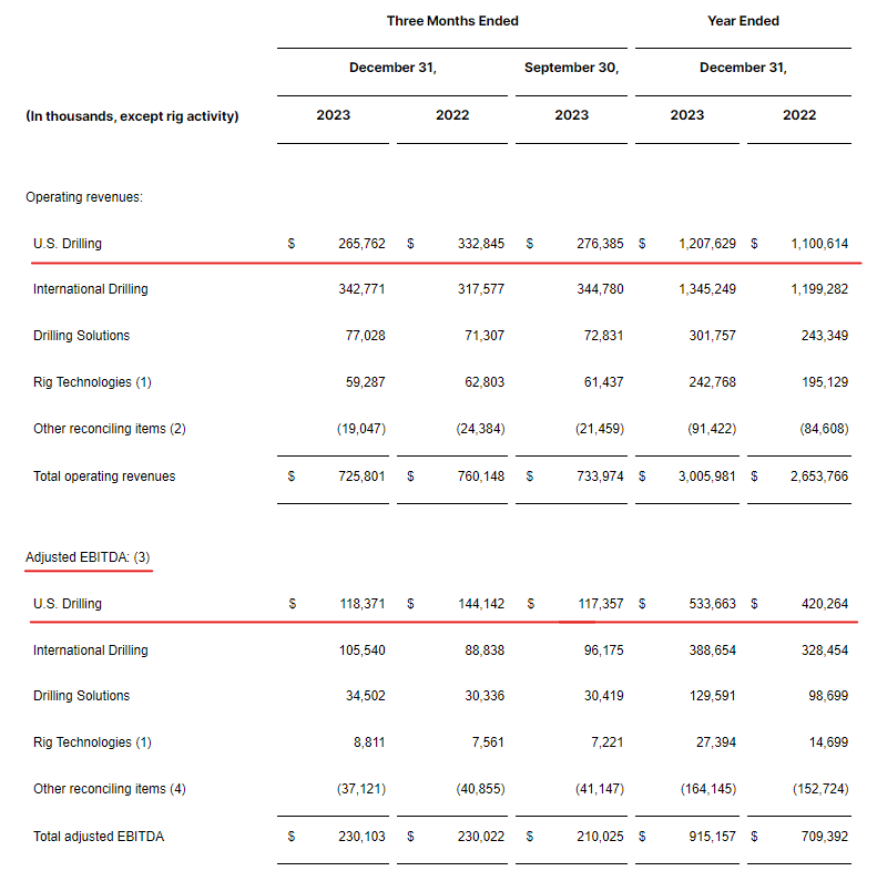 Both U.S. drilling revenue and EBITDA in 2023 were a considerable increase over 2022, even though the latter had much higher oil and gas prices.