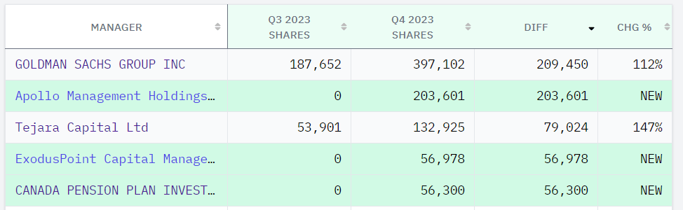 For reasons unbeknownst to me, Goldman Sachs seems to have doubled its position in Q4. The Canadian Pension Plan, a savvy institutional investor, has apparently initiated a new position.