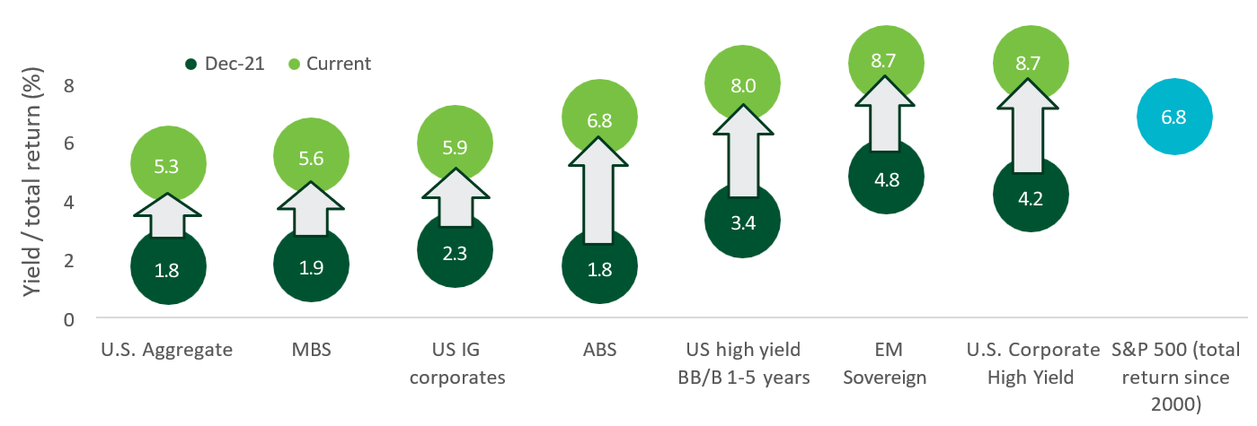 There are currently potential rewards out the curve. Bond yields look equity-like (Figure 2) at a time that equity ironically might not. Volatility is a constant threat against a backdrop of high rates, quantitative tightening, and an economic slowdown. We think locking in returns through fixed income could be a smart move.