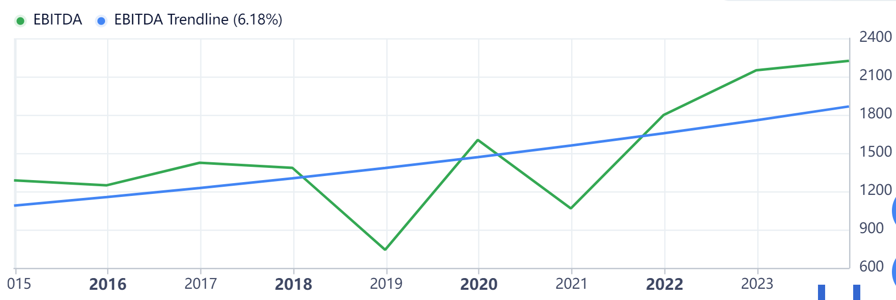 The "Infrastructure Investment and Jobs Act" and the "Inflation Reduction Act" contain considerable federal funding opportunities for companies like NiSource. Besides financing help, these legislative measures set a favorable tone for how regulators view rate adjustment requests. Supportive federal funding, combined with less resistance to rate increases, paves the way for NiSource to continue its improving earnings growth. NI generates revenues and earnings from its natural gas distribution operations (70% of sales) and electric division (30%). Revenues can be variable year to year due to the underlying commodity's price ups and downs. Last year's 6% decline in revenues reflect natural gas' most substantial percentage decline since 2006. On the other hand, 3 favorable rate increases for both segments in 2023 and operational efficiency helped earnings increase, sustaining the 6% earnings growth trend line since becoming a pure play utility. The chart below shows the utility's EBITDA trend line since 2015.