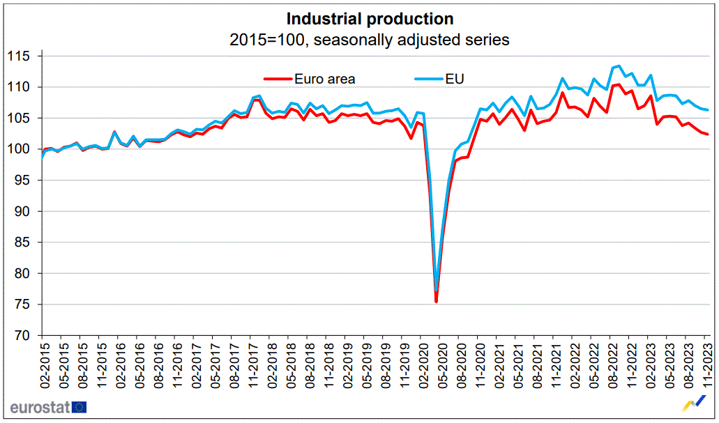 As we can see, the last few quarters have seen very little growth compared with the same quarters from the previous year. In other words, the EU economy keeps decelerating. One of the key contributing factors is the decline in industrial output that started in 2022 and seems to just keep heading in the same direction.