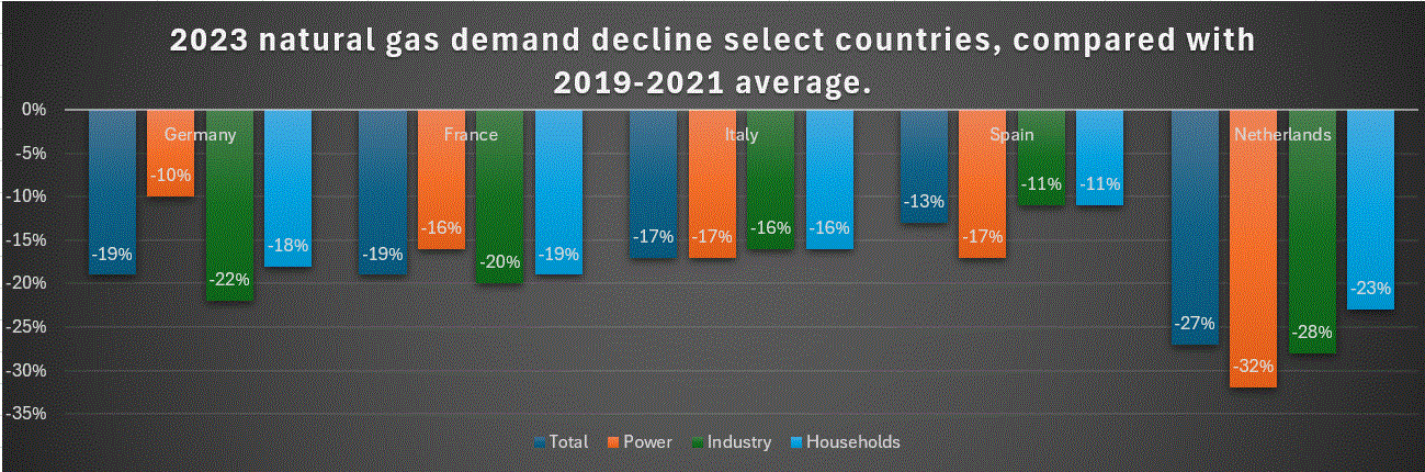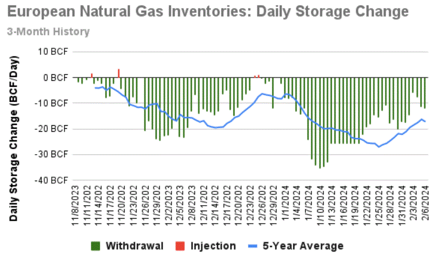 As we can see, natural gas consumption in the EU's largest economies declined dramatically in 2023 compared with the pre-Ukraine war averages of the 2019-2021 period. All sectors had to participate to make up for the net loss in supplies caused by the EU's efforts to end its dependence on Russian natural gas. What made it easier for households to participate has been a string of mild winters in the past few years. The 2022-2023 winter was considered to be the second-warmest on record. The current winter seems to be largely a repeat of last year, with only two brief cold spells causing an above-average daily drawdown of inventories for the entire winter. To be clear, those cold spells were by no means out of the ordinary, but rather just a return to longer-term average temperatures.