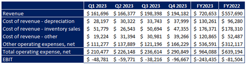FY2023 was particularly bad for Sunnova, as a result of both the slowdown in the PV market due to rising interest rates and the higher module and installation costs. The situation is gradually improving, but revenues and marginality experienced both a downturn. Q4 2023 was particularly affected by an increase in operating expenses, being $290m, up 22.9% from Q3 2023. Full-year OpEx rose to $964m vs. $639m in FY2022, up 50.8% YoY. The main drivers of this increase are personnel costs, +$74m vs. FY2022, +$60m in operation & maintenance costs and +$68m other various items.