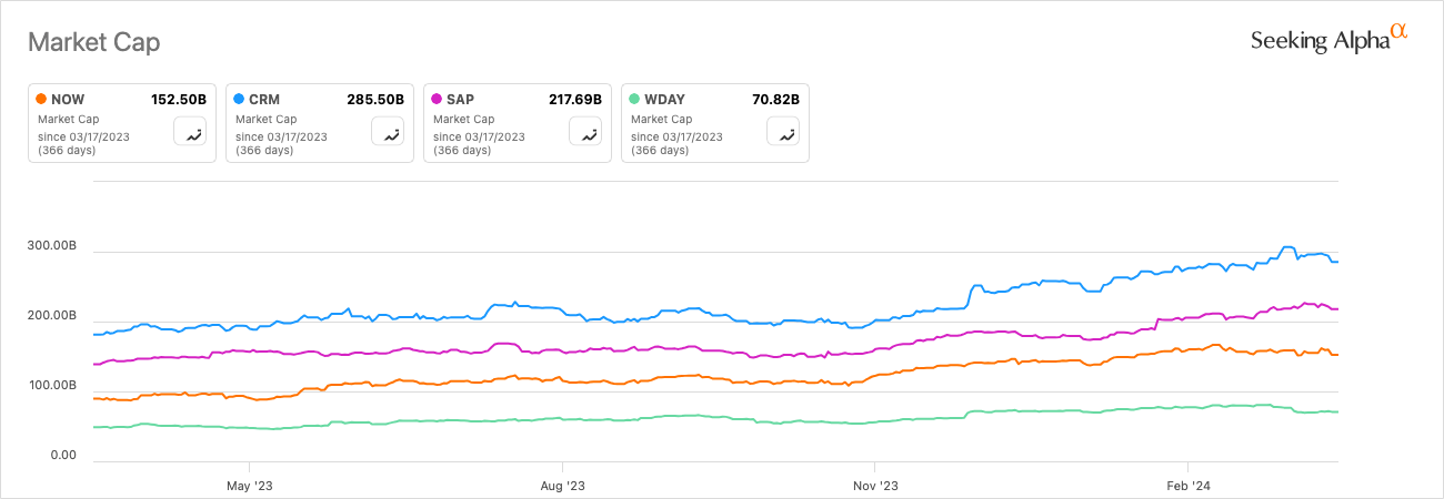 ServiceNow competes with a range of IT management and digital workflow providers, including IBM (IBM), CA Technologies from Broadcom (AVGO), Microsoft (MSFT), AWS, and Salesforce (CRM). However, due to the large differences in operations of these peers and significant variations in market cap, I have chosen instead a peer analysis of NOW, CRM, SAP (SAP), and Workday (WDAY):