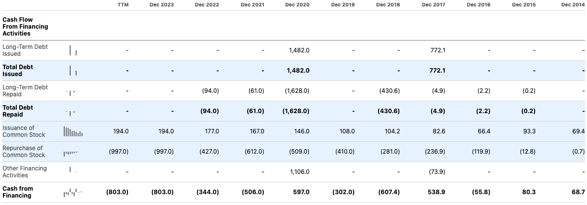 After reviewing ServiceNow's financials, I can safely say that I like the way it manages its capital. For example, its equity-to-asset ratio of 0.44 is supported by the low frequency of issuance of long-term debt and a quick and stable repayment of such debt. Additionally, due to its well-managed and not overleveraged balance sheet, it has the ability to reasonably repurchase common stock, which it does so aggressively and has been doing for the past decade every year.