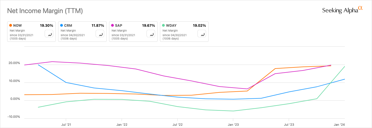 Recently, NOW also commands very high net margins when compared to its peers. For example, consider the following chart, which shows its net margin of 19.3%, second place only slightly to SAP: