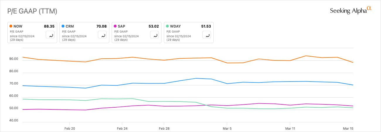We can also look at the stock relative to the peers I have used in my competitive analysis, where it does appear to be selling at a significant premium based on GAAP measures, even higher than CRM. However, we must bear in mind that earnings estimates for NOW are slightly higher than for CRM, so I believe that the market has priced both companies accordingly.