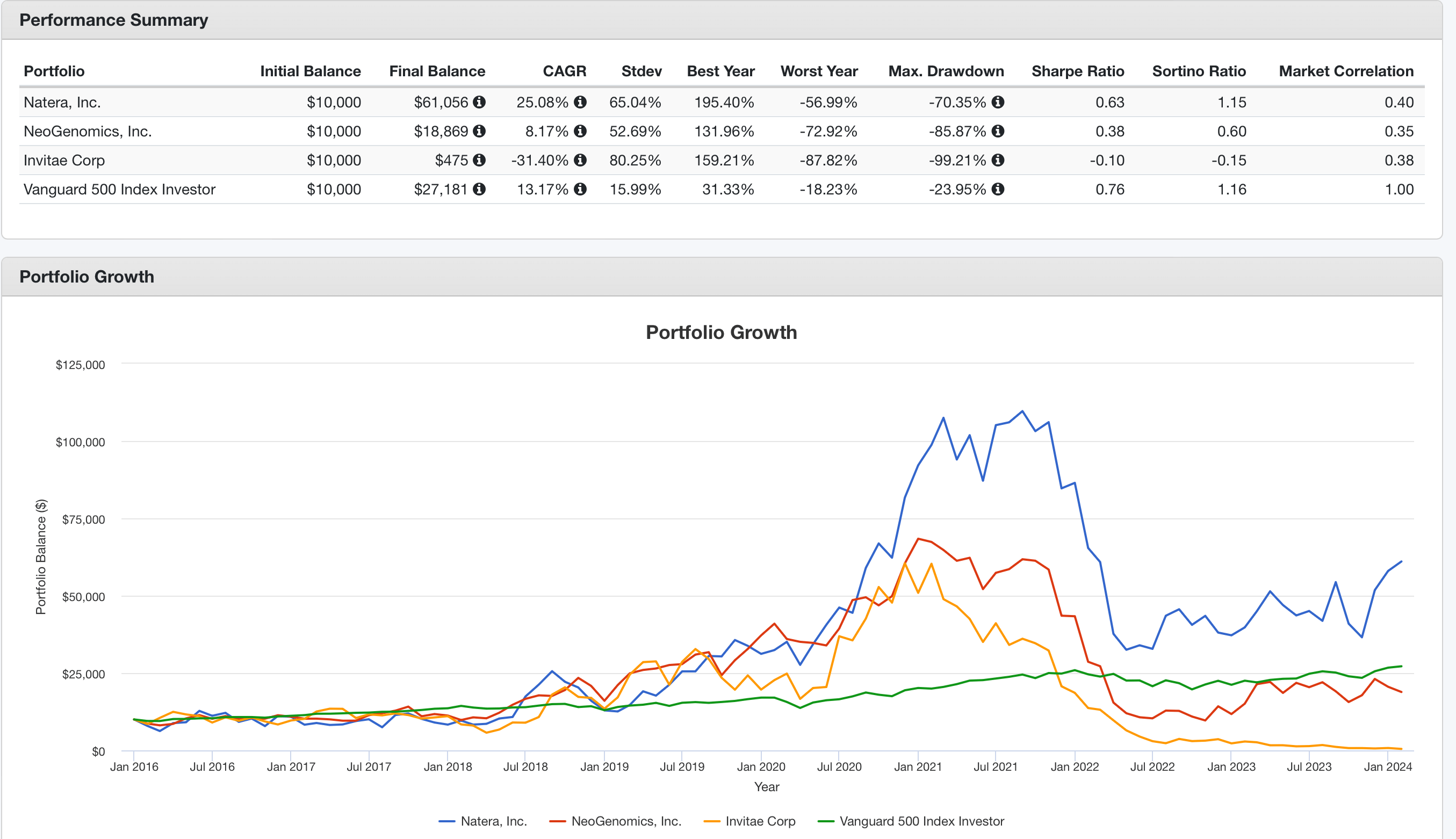 Although, past performance does not guarantee future results, the results of a hypothetical investment of $10,000 on Natera Inc., versus doing it on Neo Genomics (NEO) or Invitae (NVTA) are pretty favourable to Natera, as you can see in the chart below (plotted using portfolio visualizer back test tool).