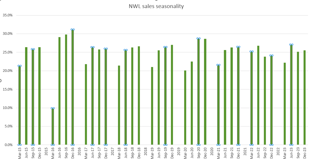 NWL appears to be tracking well against this sales guide, as management mentioned they are off to a better-than-expected start in January than implied in the guidance. Remember that January is a light-season month and 1Q is typically the smallest quarter (relative to other quarters of the year), which means we should see a similar trend for the rest of the year (if seasonality for FY24 remains the same as in the past). There are two other reasons why I believe FY24 will have a better performance than FY23. Firstly, this year, NWL will launch eight innovations, including some new products and services. For example, the Sharpie creative markers will be available in March, and the rest of the innovations will mainly be launched in Q2 and Q3. Secondly, the new distribution wins with new customers that were announced in late 2023 will begin to be delivered in FY24.