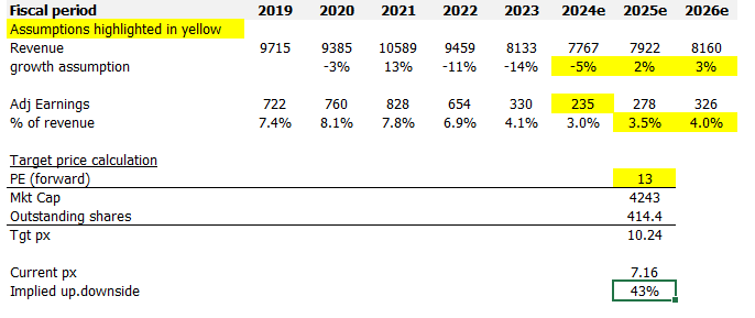 I think the upside opportunity here is quite attractive if we see continuous acceleration in growth and margin improvement. In my opinion, if NWL executes well on its growth opportunities (new product launches and distribution won in late FY23), growth should turn positive by FY25 (FY24 to come in line with guidance) and further acceleration in FY26. My growth assumptions follow the NWL's most recent recovery cycle (post-2009), where the first year of recovery was in the low-single-digit percentage range, followed by modest improvements. For margin, I am expecting further expansion over the next few years as the factors I discussed above bear fruit. I believe that NWL can eventually reach its historical margin level, but since a part of NWL's growth strategy is to roll out new products, I expect management to step up on reinvestments. Hence, I don’t expect the margin to reach back to historical levels in the near term. My model assumes NWL net margin to recover to FY23 levels by FY26 and FY24 to follow management guidance (calculated from its guided adj EPS at the midpoint). Lastly, with anticipation that NWL performance is going to get better in the coming years, I attached a 13x forward PE multiple to NWL, which is where it is trading today, and also its average.