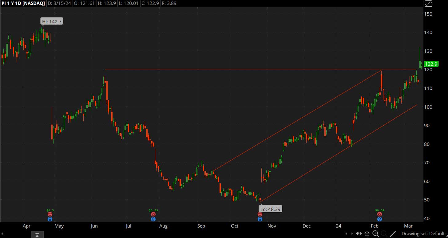 The chart above shows how the stock continued to hit new 52-week lows for the next three months or so until it bottomed at $48.39 on October 25, 2023. PI released its Q3 FY2023 report on this day and the report was able to put recent market concerns to rest with an upbeat outlook. The stock rose almost 24% on October 26, setting off a rally that continued into 2024.