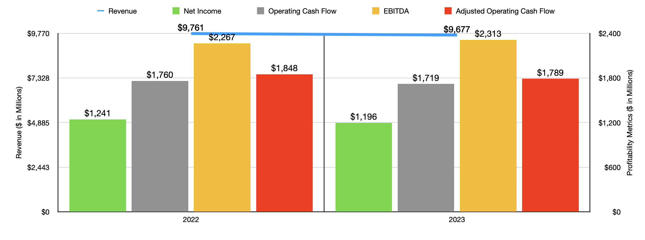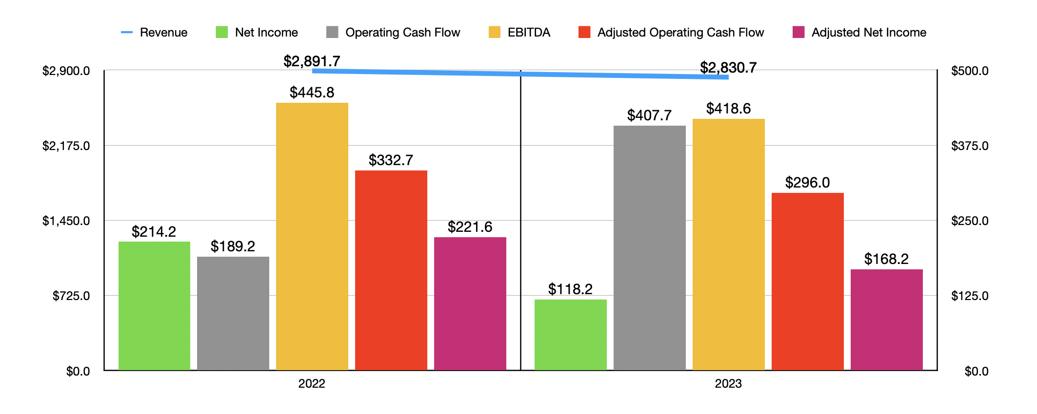 As for the current transaction, we can use updated data provided by the management teams of both firms to evaluate what all is going on. For the final quarter of the 2023 fiscal year, Masonite International reported some rather disappointing results, with revenue, profits, and cash flows all worsening year-over-year. But even with that, the company still managed to generate $418.6 million worth of EBITDA and $290 million of adjusted operating cash flow. Net profits were $118.2 million, while adjusted profits totaled $168.2 million. Given the current terms of the buyout, we are looking at the kind of pricing for the business as shown in the second chart above, with the first showing financial results for the year.