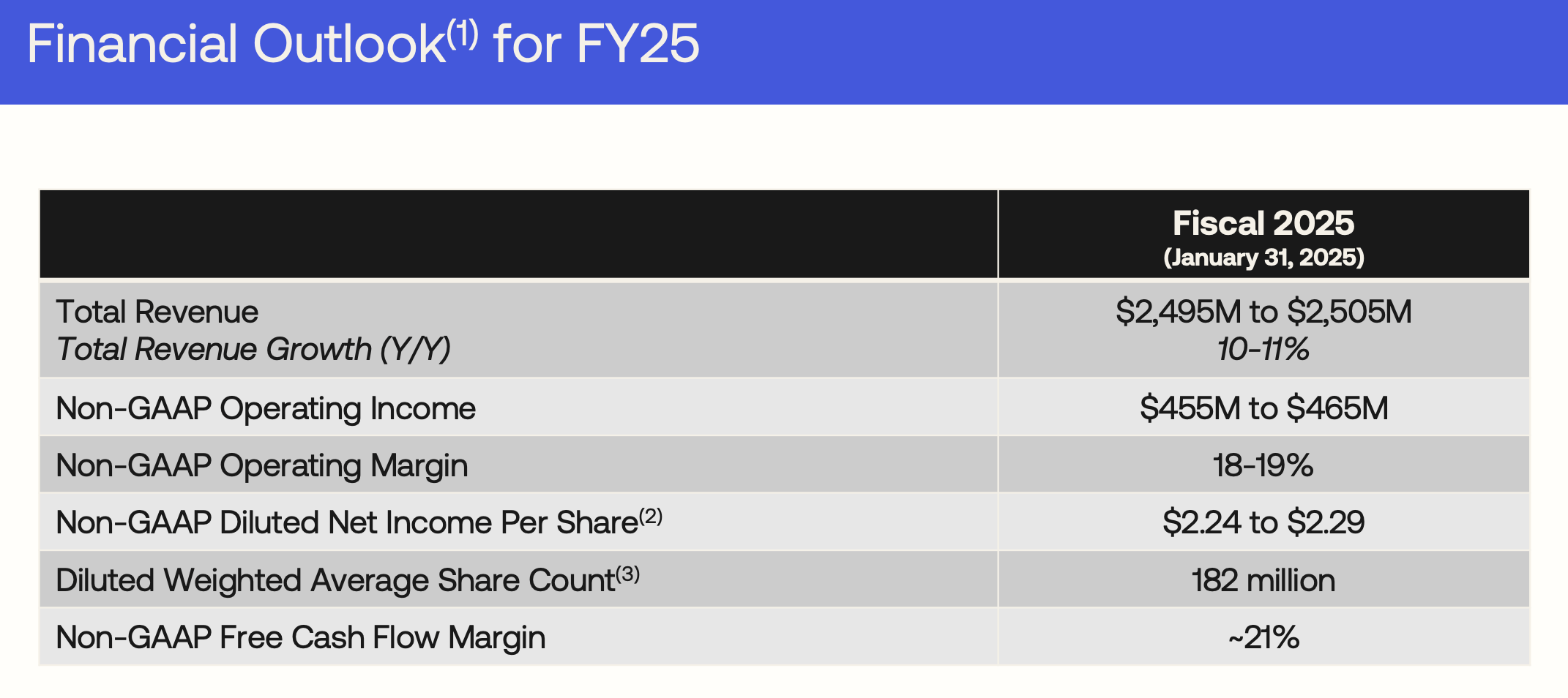 And if we apply the company's 21% FCF margin expectation against the $2.50 billion revenue midpoint of this guidance range, we arrive at $525 million of FCF, up 7% y/y (FY24 margin was 22%).