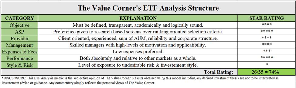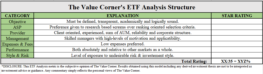 The Value Corner’s professionally developed ETF Analysis Structure has been designed to provide an easy to interpret ranking system which can be utilized across any and all ETFs and index funds.