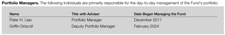 Interestingly, February 2024 has seen a new development in the fund’s management team with Liao now being accompanied by Griffin Driscoll acting as deputy portfolio manager.
