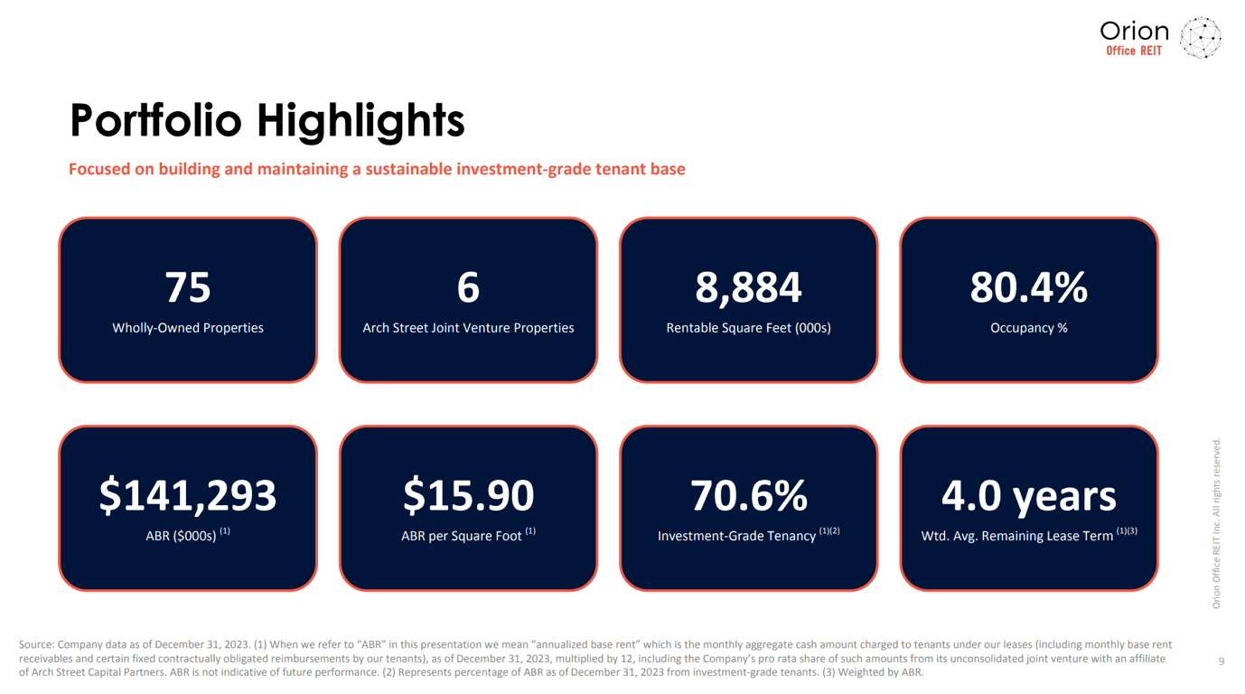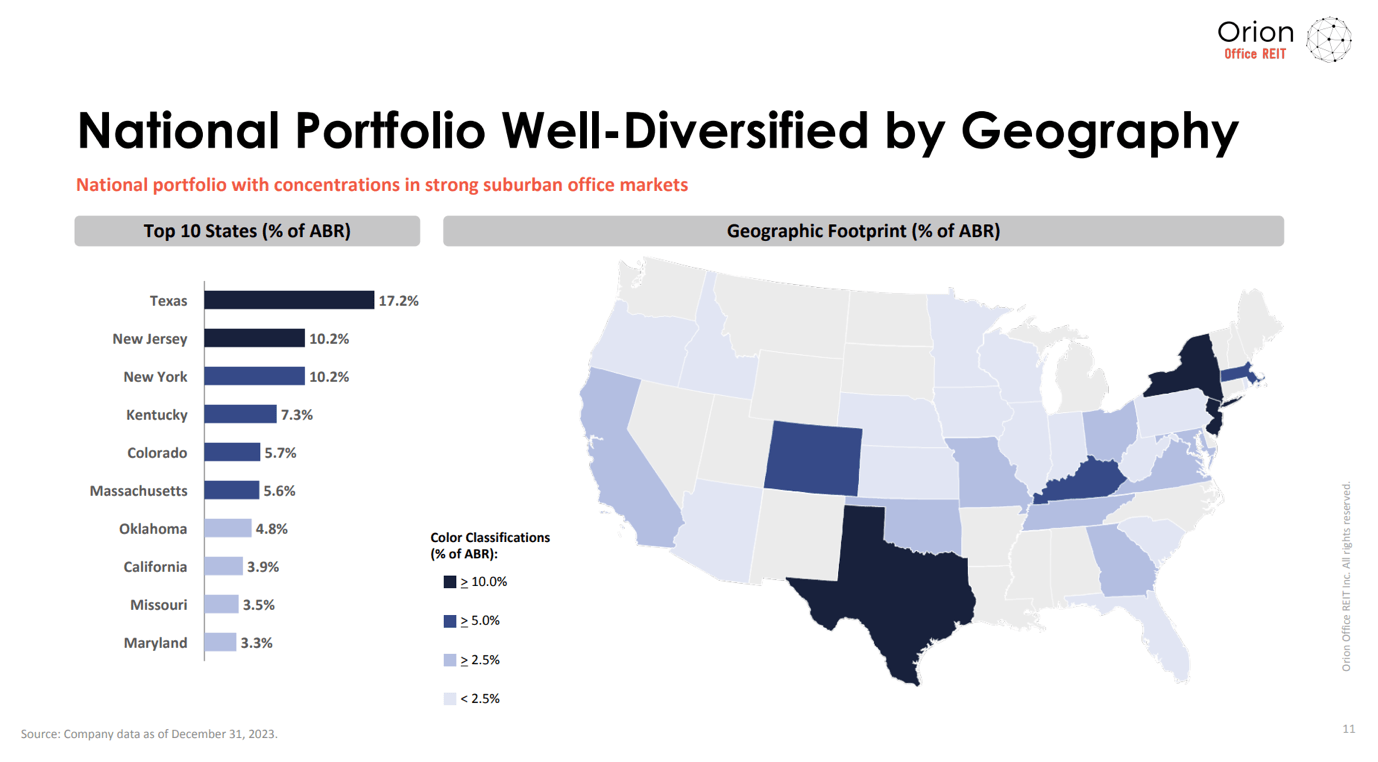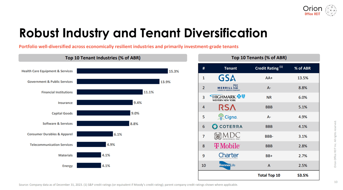 Going back to its assets, its current 55 offices have a weighted average lease term of 5.8 years. 43% of its tenants are classified as investment-grade tenants, which is one of the benefits that come with being spun off from a landlord that has a strong focus on high-quality tenants - the same applies to Orion.