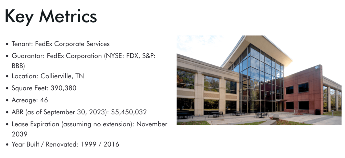The example below shows its office in Collierville, Tennessee. This is leased to FedEx (FDX). Renovated in 2016, the building has a lease through 2039.