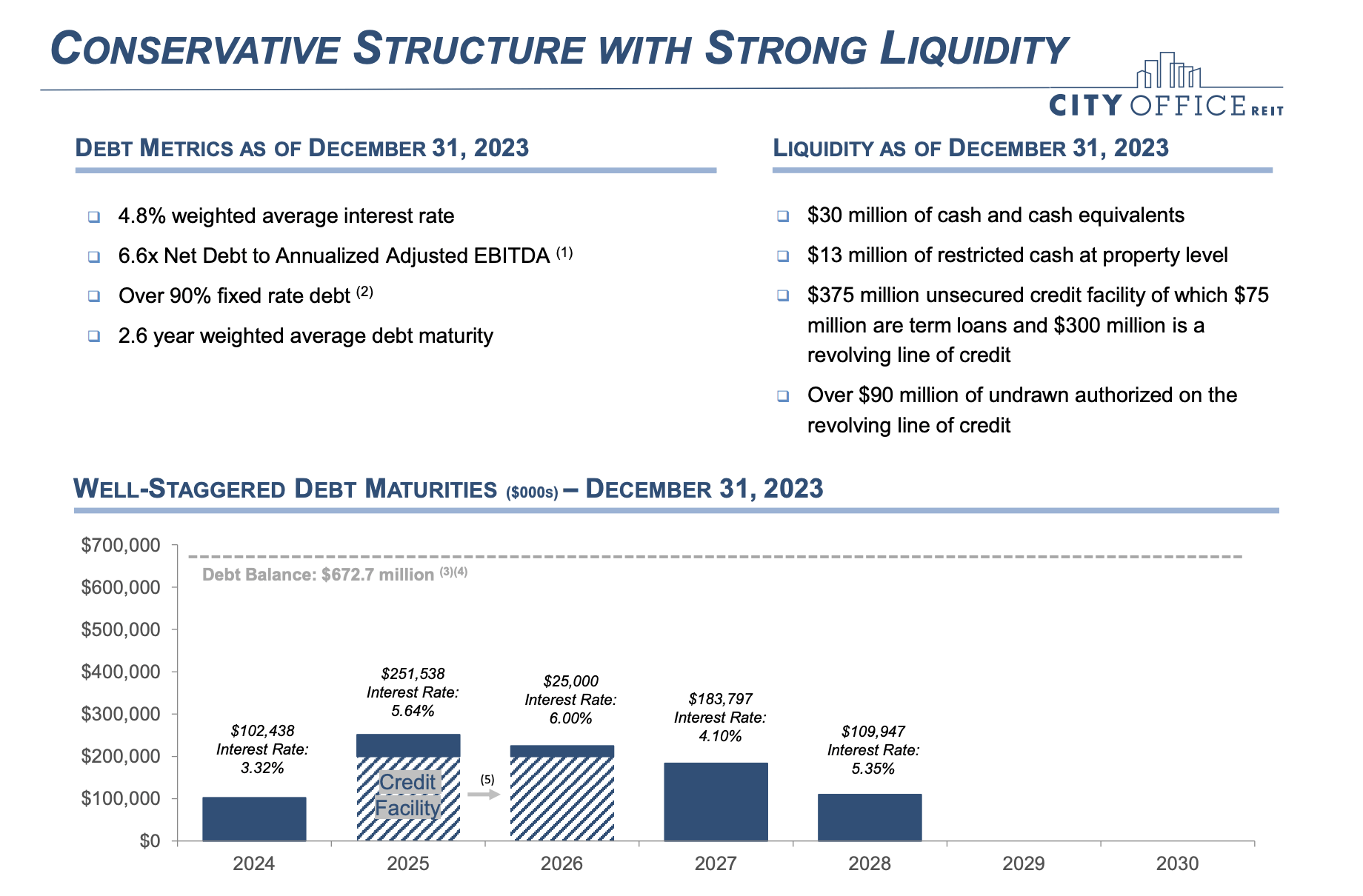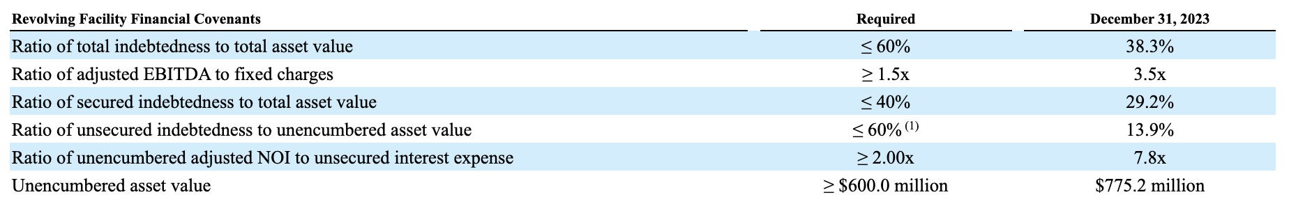 While the company is currently complying with all required covenants on its credit facility (see below), it could see a surge in interest payments if it has to refinance its debt at higher rates in the years ahead. The same applied to City Office REIT.