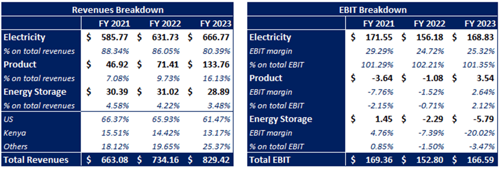 Electricity: within the segment it develops, builds, and operates geothermal, and to a small extent solar energy plants, selling the electricity produced through PPA contracts, with a weighted average term of 15 years as of December 2023. This is the main source of total revenues with a share of 80.4% in FY23, down from 88.3% in FY22; such decrease is mainly due to increased revenues in the Product segment and, to a lesser extent, a decline in electricity production due to maintenance of some geothermal plants resulting in a performance below the potential capacity.