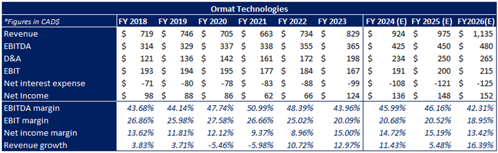 Ormat revenues increased 13% YoY to $829m in FY23, mainly because of new installations and the end of maintenance work at some plants. Such investments have been financed through debt for $1B, stock issuance for $682m and operating cash flows, which was equal to $309m in FY23. They also enabled the reduction of operating costs, with EBITDA and Net Income margin reaching 44% and 15% respectively. I expect further revenue growth in the next 3 years, thanks to the acquisition of ENEL's assets, the installation of new plants as well as increased revenues in the Product segment. Moreover, I believe margins will be in line with FY23, positively impacted by improving marginality in both Products and Energy Storage.