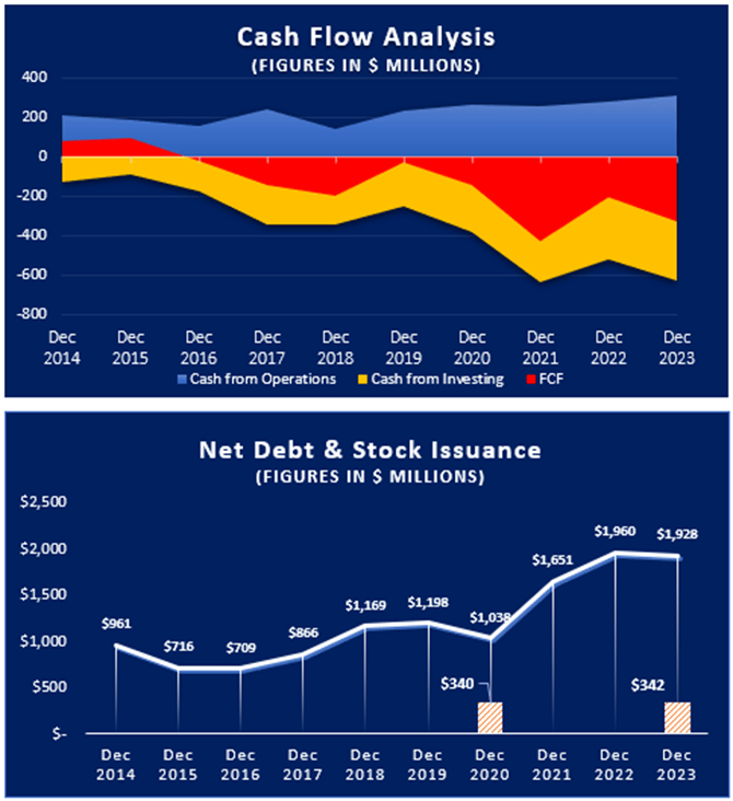 As can be seen in the above charts, ORA had always achieved negative Free Cash Flow between FY16 and FY23, especially since FY20 when the new plant construction campaign intensified. The data highlights how Ormat was not able to produce positive FCF even in years of lower growth and investment.
