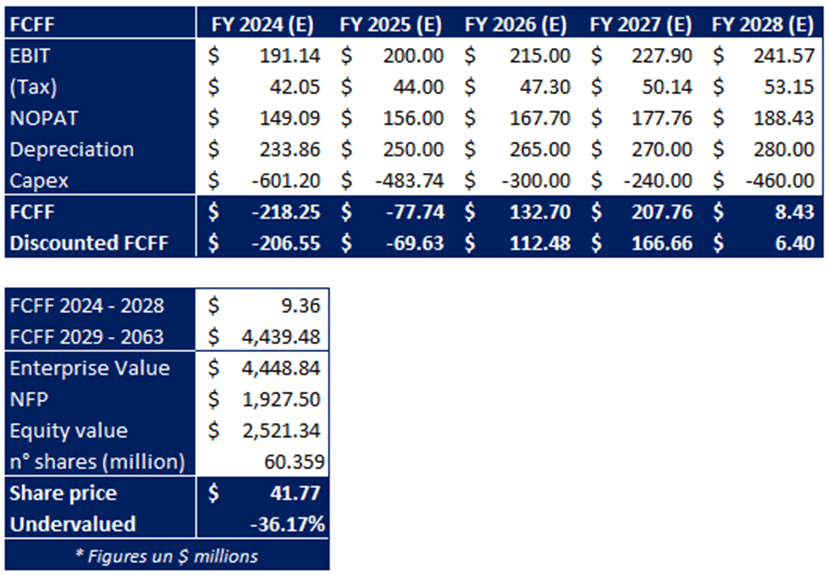The model returns a value of $41.77 a share, about 38% lower than the current market price. This is consistent with my bear expectations, as FY24E EV/EBITDA of 13.8x and FY24E P/E of 29x are multiples too high compared with the companies analyzed in the sector in previous articles.
