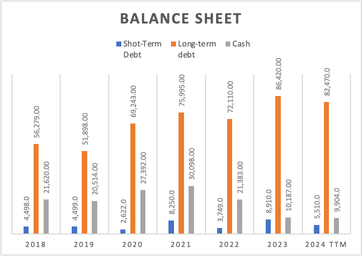 Lastly, I will suggest what could be the stock price for 2029. For this, I will try to predict the value of each element that conforms to equity. To make this I will assume that these elements will continue to evolve at the rate displayed in 2018-2029. This means that short-term debt will be increasing at an annual pace of 3.7%, and long-term debt by 7.8%. Meanwhile, marketable securities will contract at an annual pace of 9% and current assets by 12.05%.
