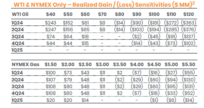 This includes $201 million in positive hedge value and is also based on current strip prices of roughly $79 WTI oil and $2.35 NYMEX gas. Ovintiv has close to 50% of its 2024 natural gas production hedged, with those hedges having a neutral value at $3.50 gas.