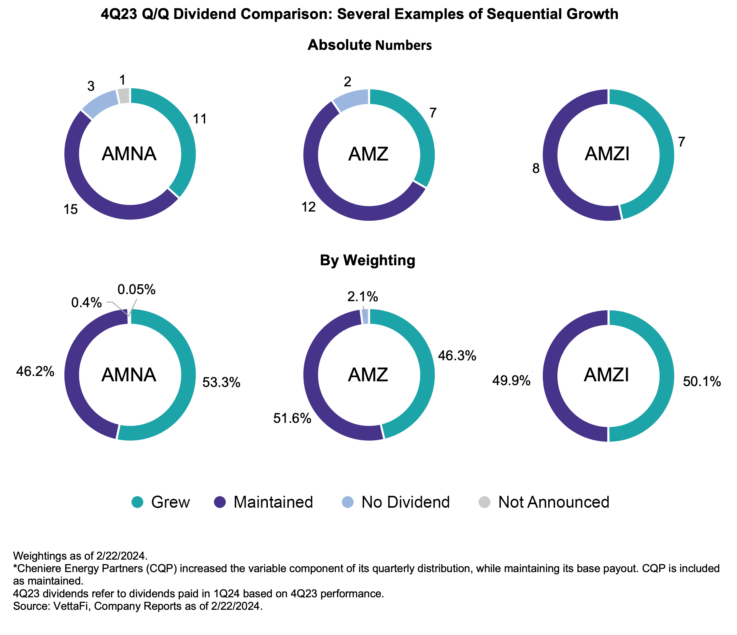 The pie charts below show the quarter-over-quarter changes to dividends for AMNA, the Alerian MLP Index (AMZ), and AMZI by comparing 4Q23 payouts to those made for 3Q23. To be clear, 4Q23 dividends refer to the dividends paid in 1Q24 based on operational performance in 4Q23. For AMNA, more than 53% of the index by weighting as of February 22 increased their payout sequentially.