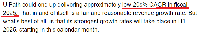 That being said, when UiPath guides for fiscal 2025 to see its underlying non-GAAP operating margins reaching 19%, I believe this echoes my assertion. Meanwhile, the fact that this early in the game UiPath has already delivered 27% non-GAAP operating margins does imply that there's scope for increased profitability and that we should, in actuality, see UiPath's 19% non-GAAP operating margins as a base.