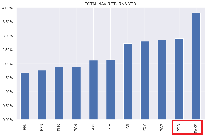 There are two market themes worth highlighting for the taxable suite. One is the reversal of performance this year from that of last year. Specifically, last year we saw an underperformance of CMBS-overweight funds like PDO and PAXS. However, this year the funds are in the lead.