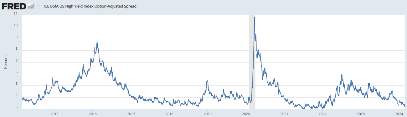 However, there is a catch which is that, unlike actual credit assets, the swaps don't really generate any new capital. PIMCO is simply getting back its $38.5m premium it paid in the form of an annuity. Why is it doing this? Perhaps it's not finding many attractive assets to buy at the moment - after all, credit valuations are very expensive as this chart of High Yield corporate bond credit spreads shows. At the same time, it doesn't want to lower the income it generated had it simply moved into cash. So it could simply be using the capital that would normally go to buy actual credit assets with a higher-"yielding", risk-free alternative, perhaps waiting for a better entry point.
